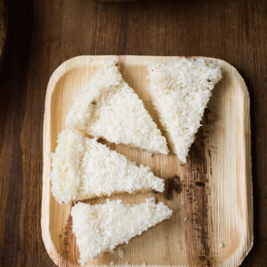 - Give the tari a quick rinse, and soak in water, milk and the grated coconut for ½ an hour.
