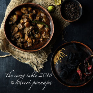 This is a slightly different, and entirely delicious pandi curry. This recipe is from my aunt’s mother, & as a cook’s tip, she shares this with us – she never hurries pork by pressure- cooking it, preferring to allow it to cook slowly, to release fat and natural flavours. The result is, deep flavours, and succulent pork, cooked to perfection. She also uses gingelly oil, which was the traditional cooking medium in Coorg, which adds its own memorable flavour to this curry. I can vouch that slow cooking the pork is worth every bit of the effort !
